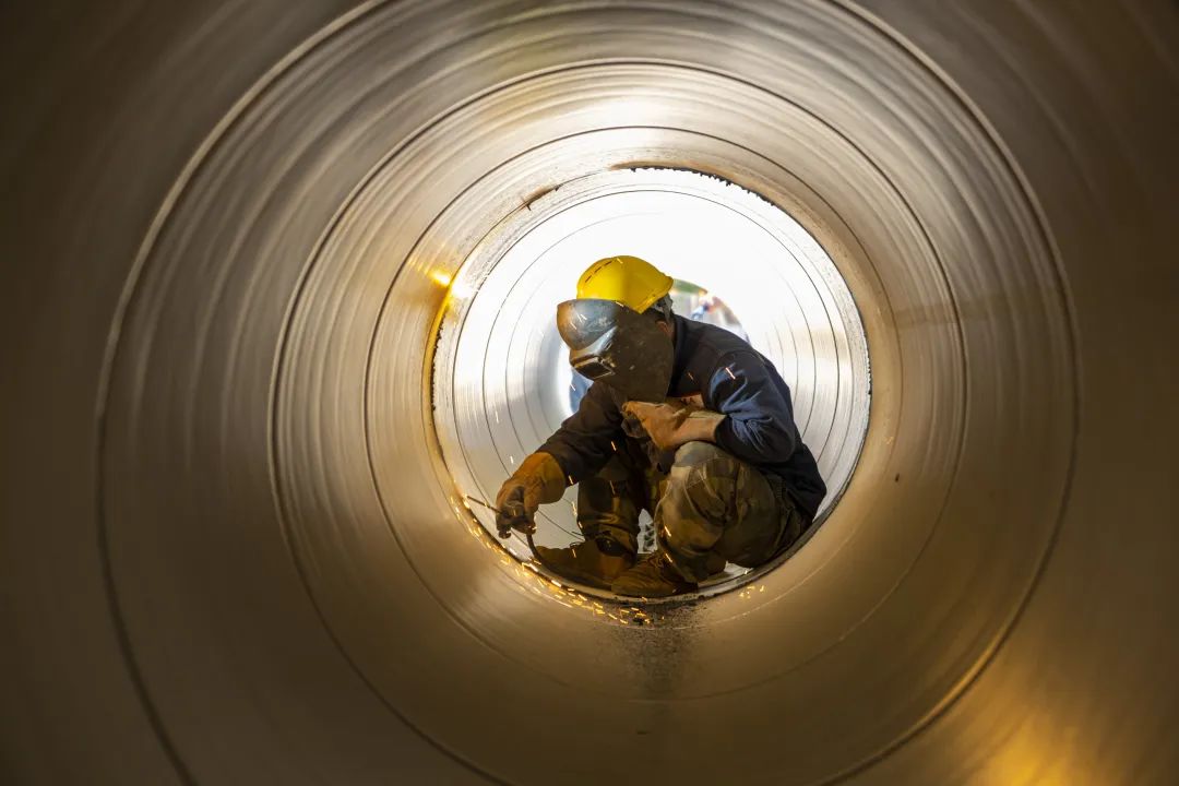 ▲綠城水務加快推進五象供水加壓站擴建DN1000出水管建設,圖為施工工人正在焊接管道。水建公司 金志華供圖
