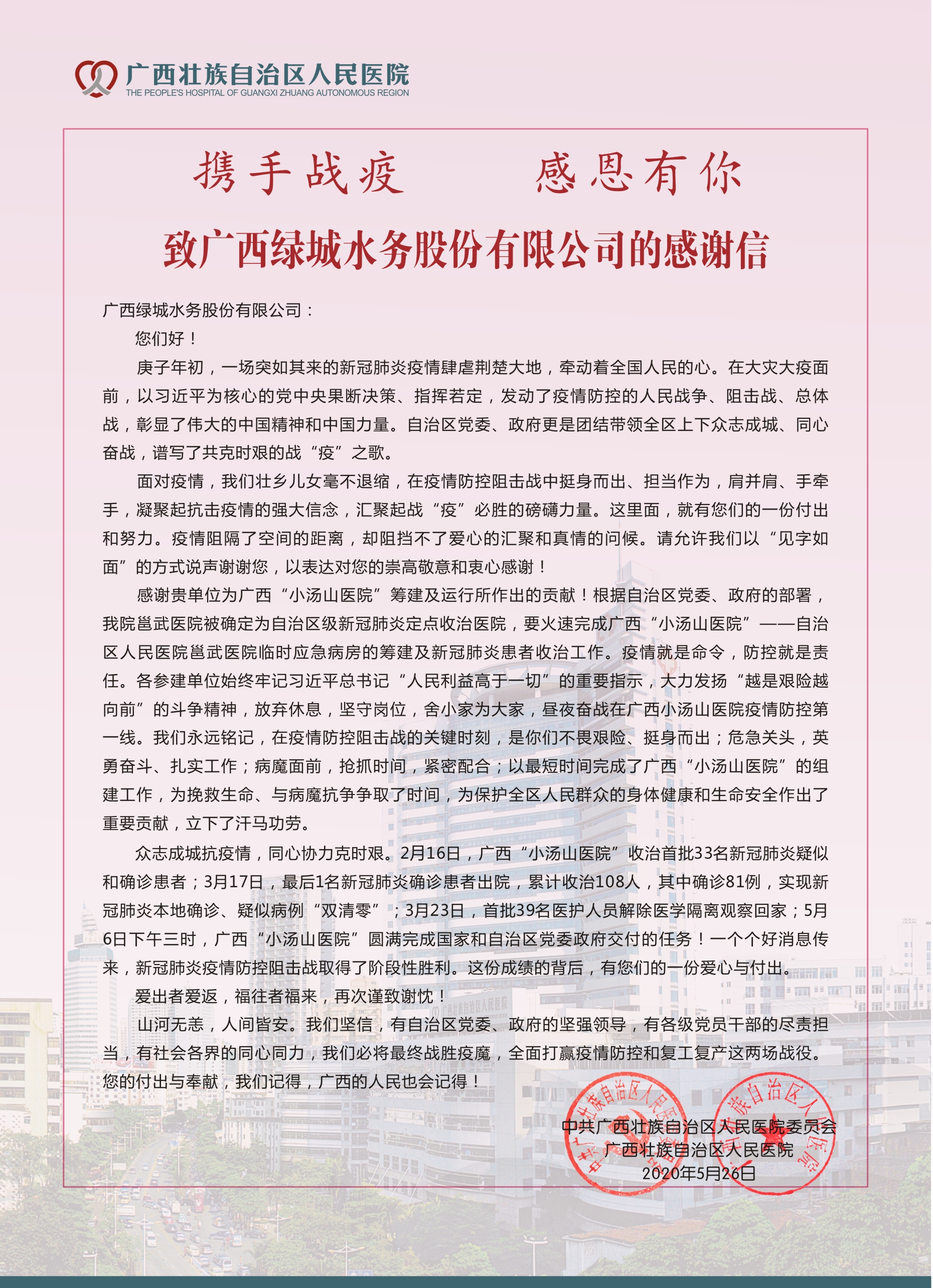 (圖為自治區人民醫院發來的感謝信)