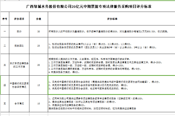 附件:廣西綠城水務(wù)股份有限公司20億元中期票據(jù)專項(xiàng)法律服務(wù)采購(gòu)項(xiàng)目評(píng)分標(biāo)準(zhǔn)